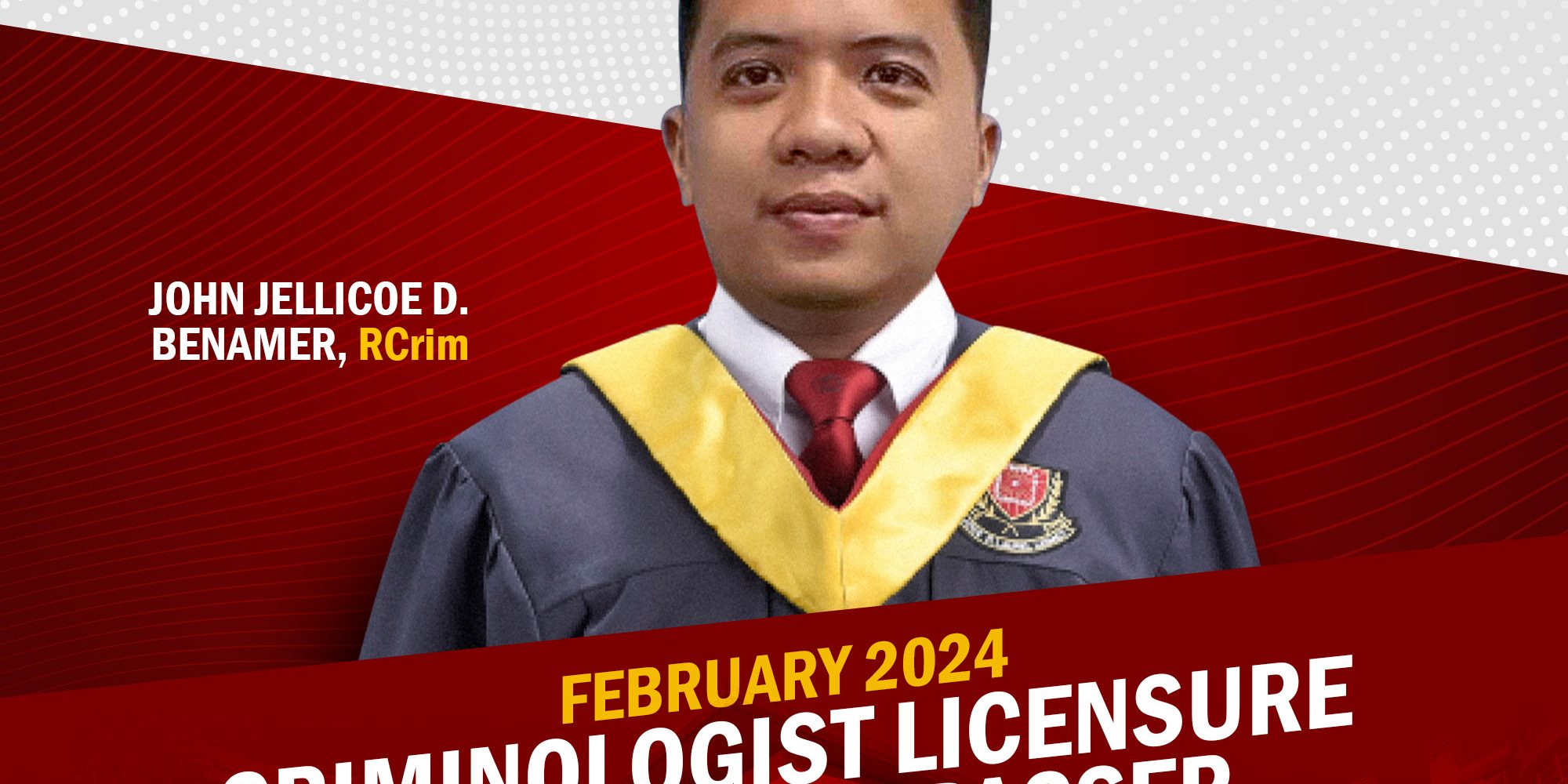 Lyceum of the Philippines University-Batangas proudly congratulates one of its own, John Jellicoe D. Benamer, for his outstanding performance in the February 2024 Criminologist Licensure Examination.