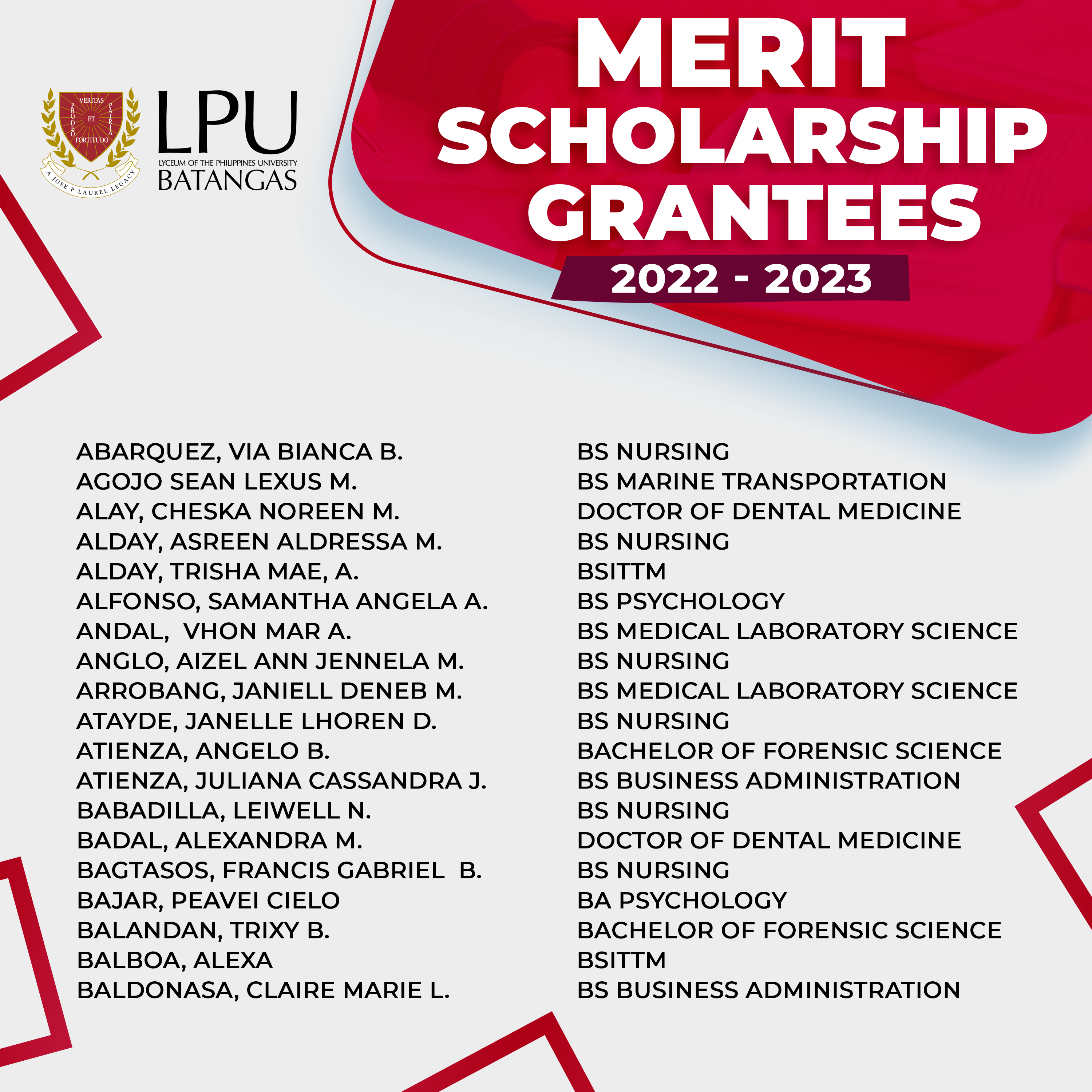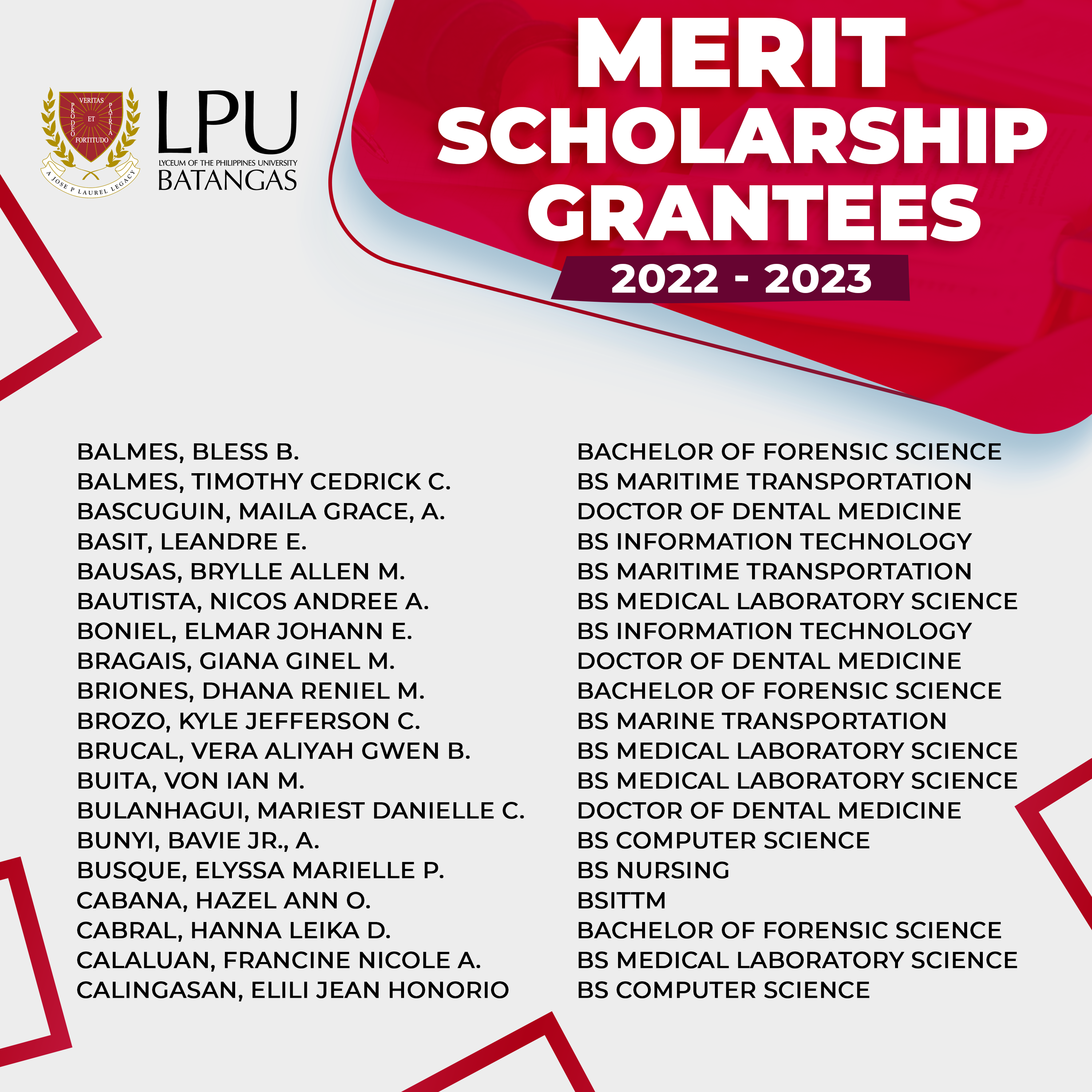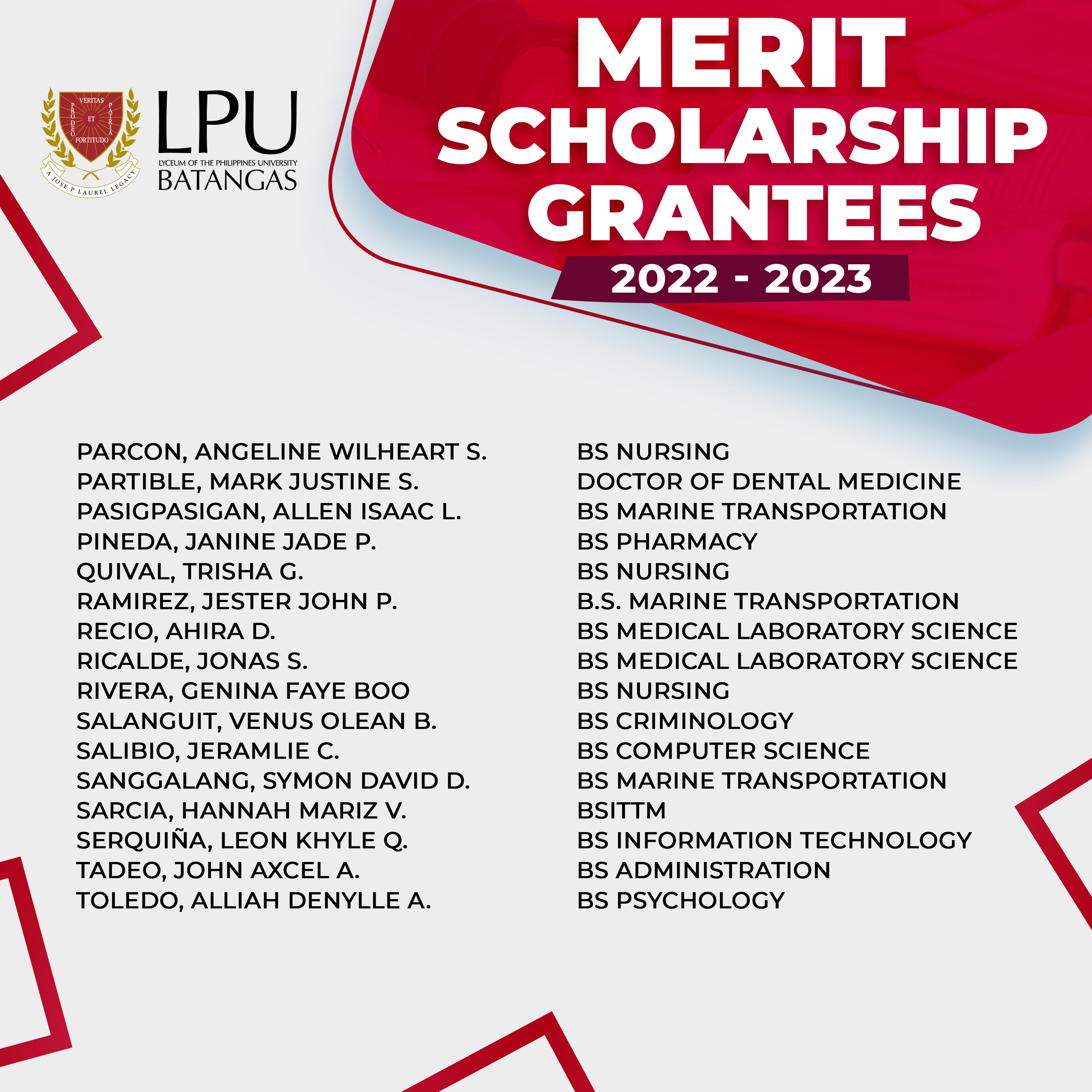 Congratulations to our New Merit Scholarship Grantees (College) for the first semester of Academic Year 2022-2023.You may enjoy from 25% to 100% discount* on Tuition Fee for one (1) academic year.