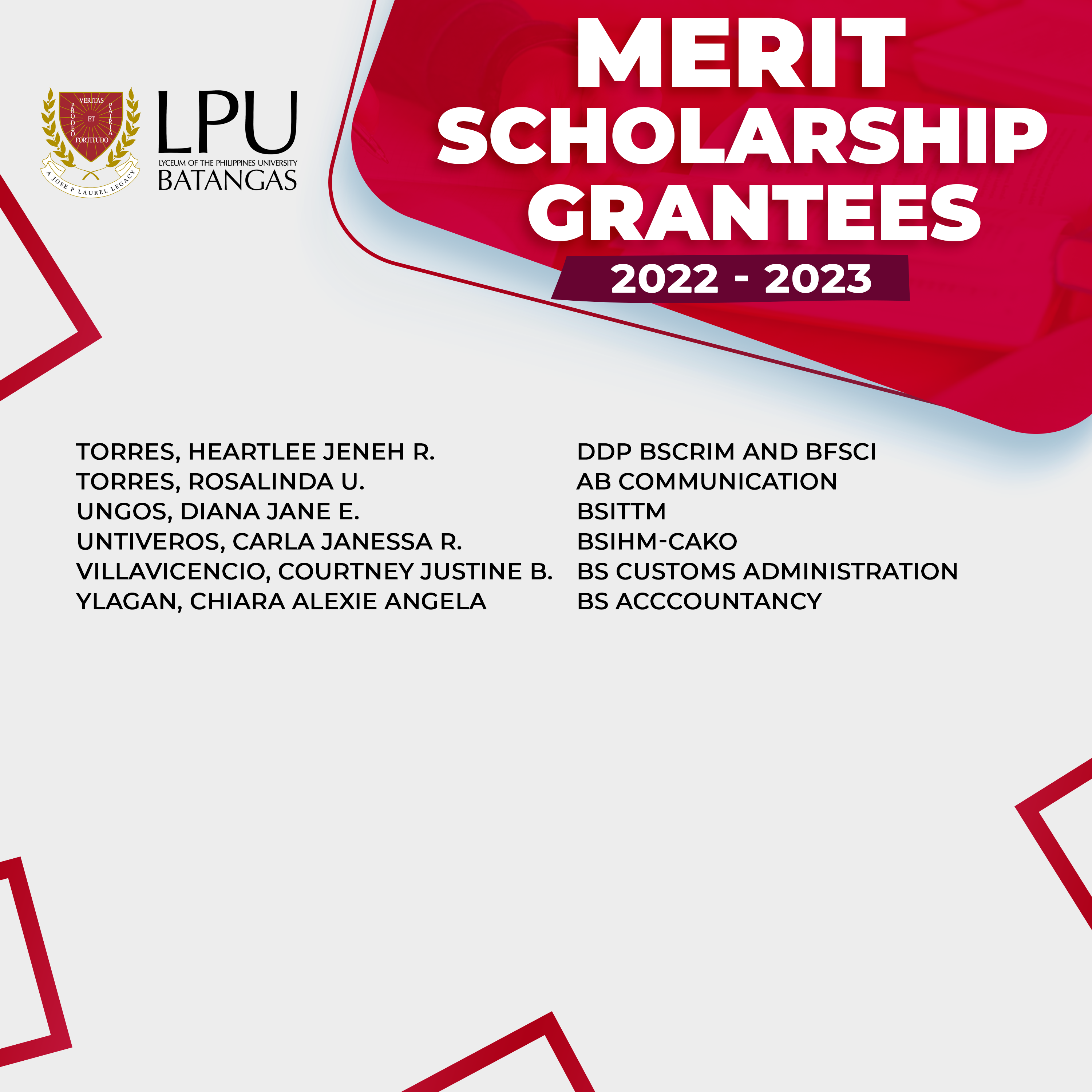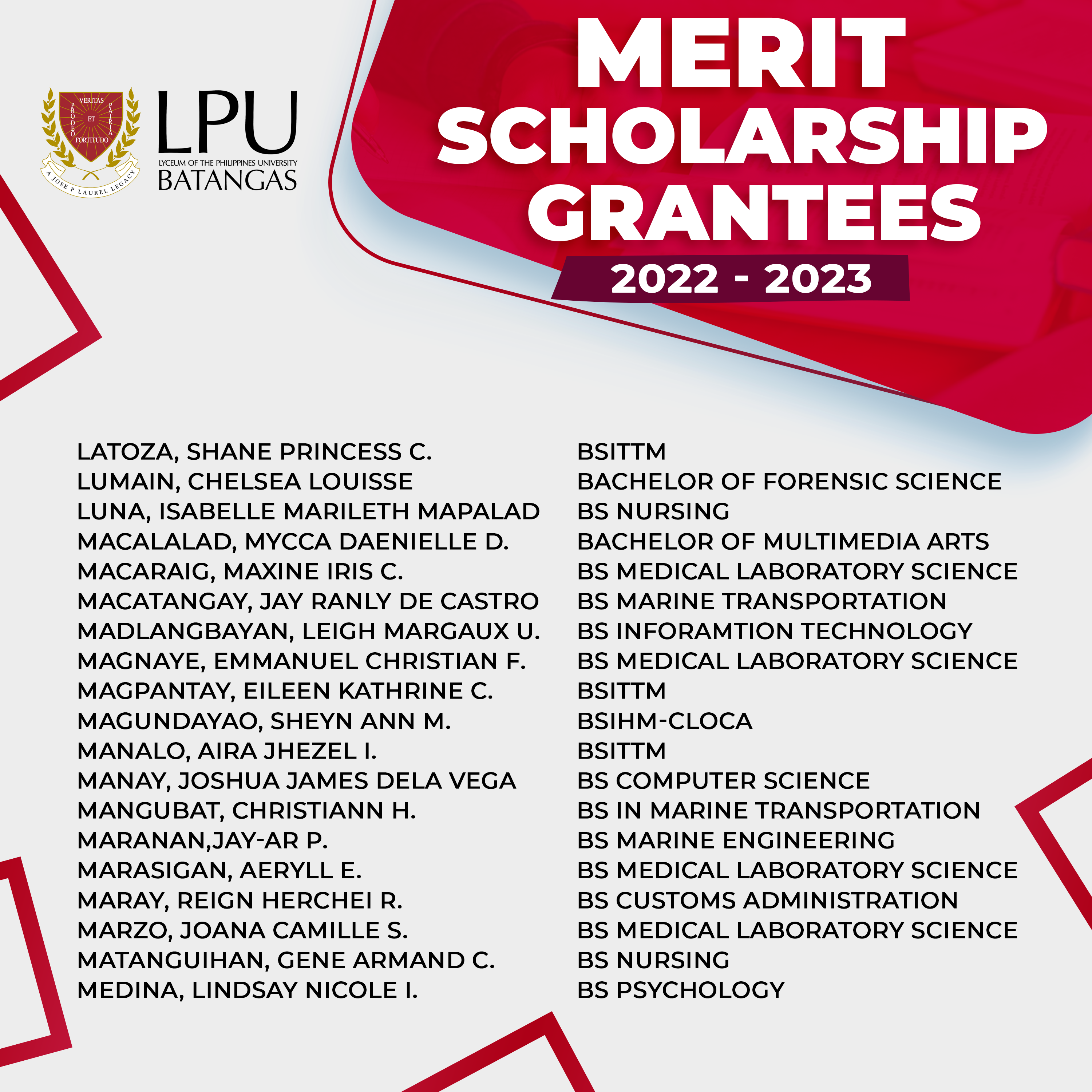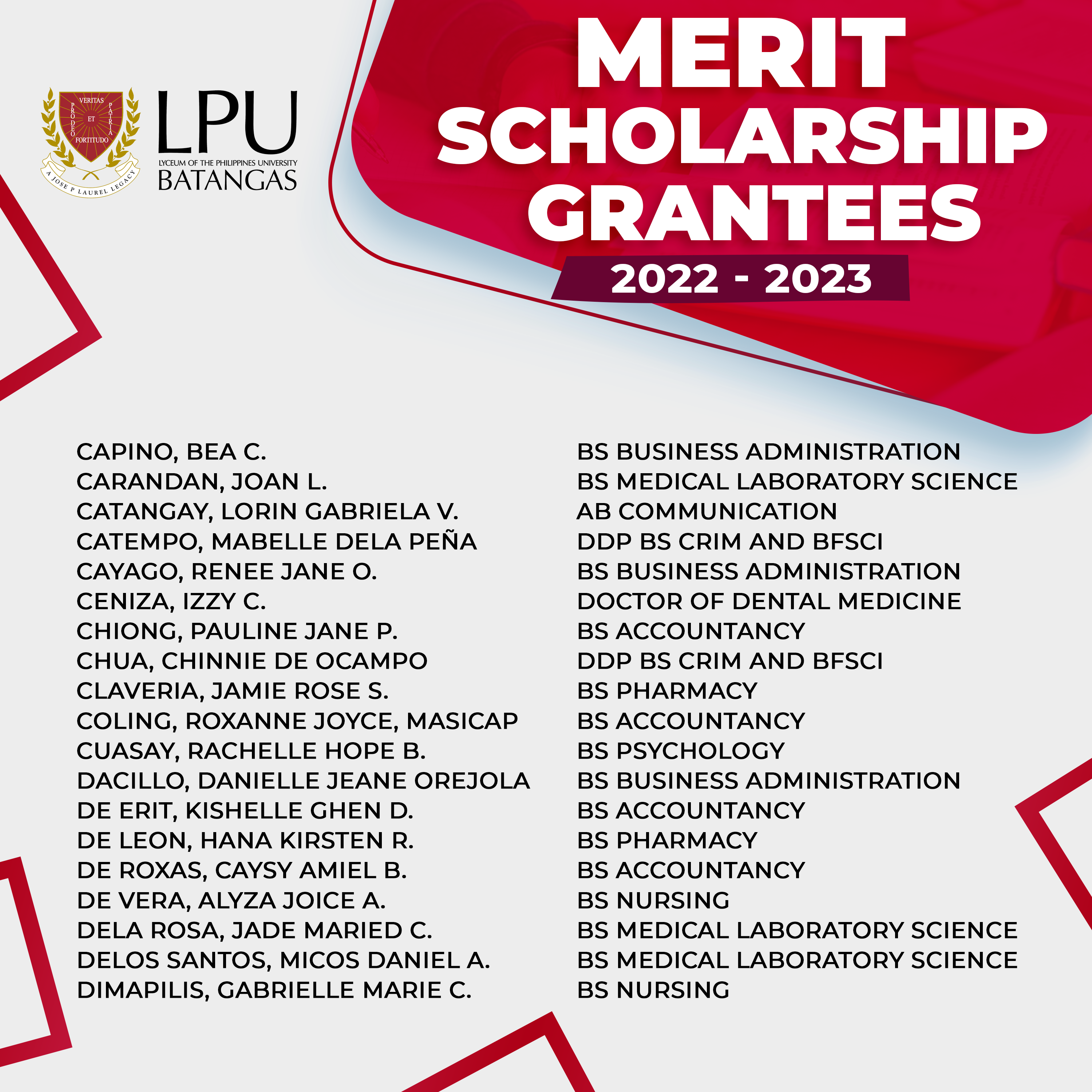 Congratulations to our New Merit Scholarship Grantees (College) for the first semester of Academic Year 2022-2023.You may enjoy from 25% to 100% discount* on Tuition Fee for one (1) academic year.