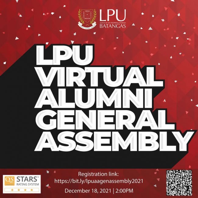 Views: 0 Calling all LPU Batangas Alumni! You are invited to the Virtual General Assembly of Lyceum of the Philippines University Batangas Alumni Association, Inc. on December 18, 2021, at 2:00 pm. The LPU Alumni Association will update the members of its upcoming projects and programs. There will also be fun games, prizes, and a…