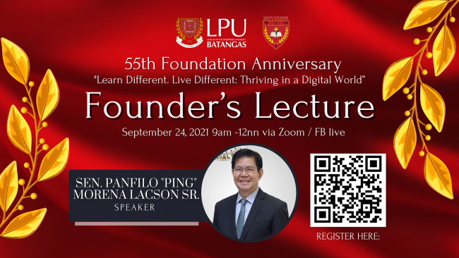 Views: 0 LPU-Batangas is honored to have Senator Panfilo “Ping” Lacson Sr. as this year’s guest speaker for the Founders’ Lecture on the occasion of the 55th Founding Anniversary of the university. This virtual event spearheaded by the College of Education, Arts, and Sciences will be held via Zoom and will be streamed on the…